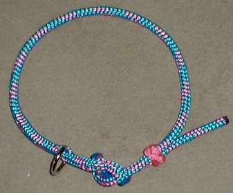 Made from 1/4" rope no hardware, ties like a rope halter with a button to hold the end. These work great for small dogs. |